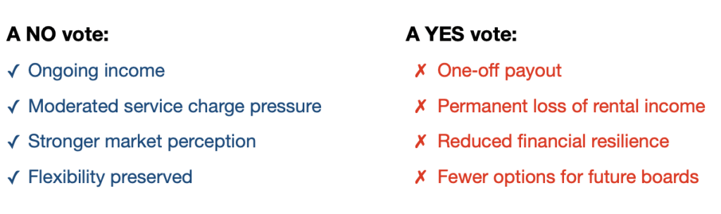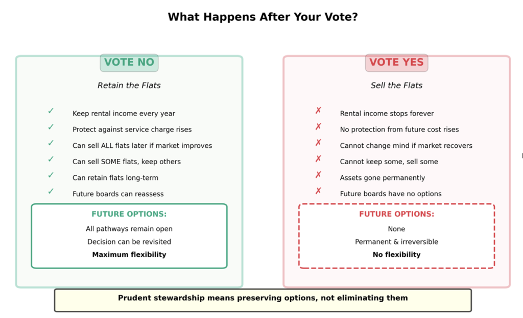 A NO vote preserves flexibility. Flats can always be sold later – in full or in part – if circumstances genuinely change. A YES vote removes that choice forever.