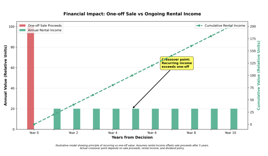 *Illustrative model showing principle of recurring vs one-off value. Assumes rental income offsets sale proceeds after 5 years. Actual crossover point depends on sale proceeds, rental income, and dividend policy.