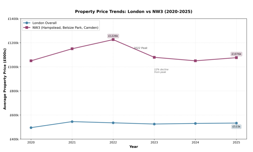 London residential values have softened since their 2022 peak and have only recently stabilised. NW3 remains below prior highs.