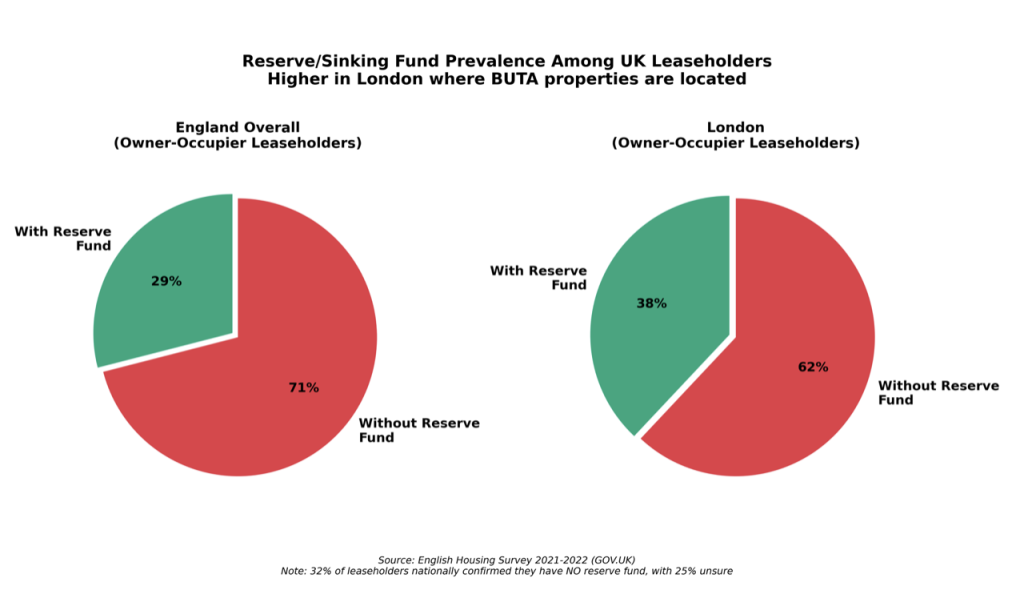 English Housing Survey data (2021–2022) indicates that 57% of leaseholders either lack a reserve fund or are unsure one exists, a factor that heightens buyer and lender concern about major works risk.