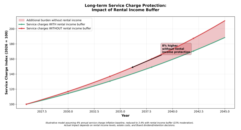 *Illustrative model assuming 4% annual service charge inflation baseline, reduced to 3.4% with rental income buffer (15% moderation). Actual impact depends on rental income levels, estate costs, and Board dividend/retention decisions.
